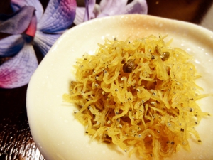 - ひと口ほおばると、小ぶりのおじゃこと、ピリッとしたアクセントの山椒の実を